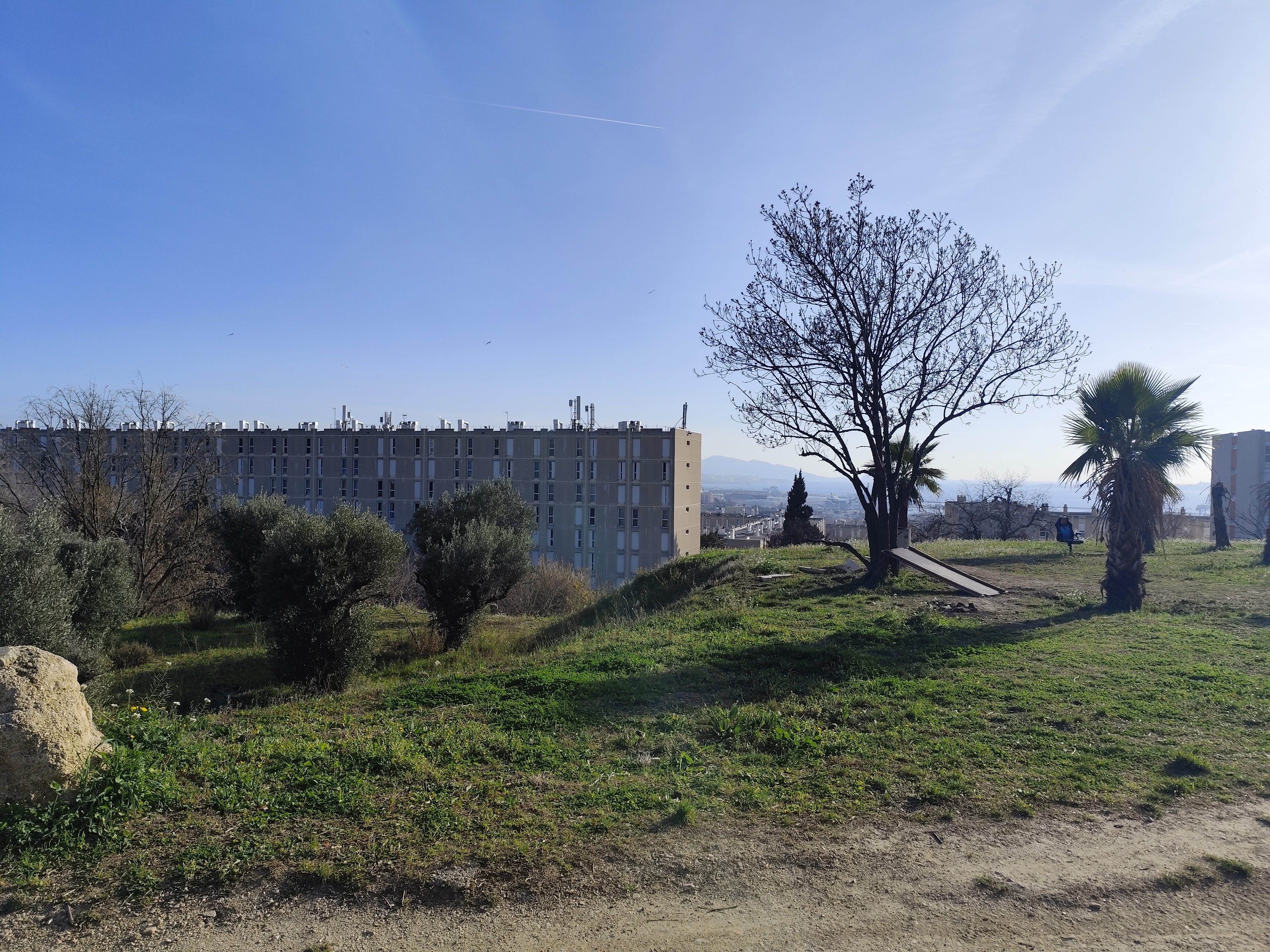 Depuis la Jougarelle on surplombe la Castellane, ses grandes tours, mais aussi toute la beauté de la rade de Marseille.